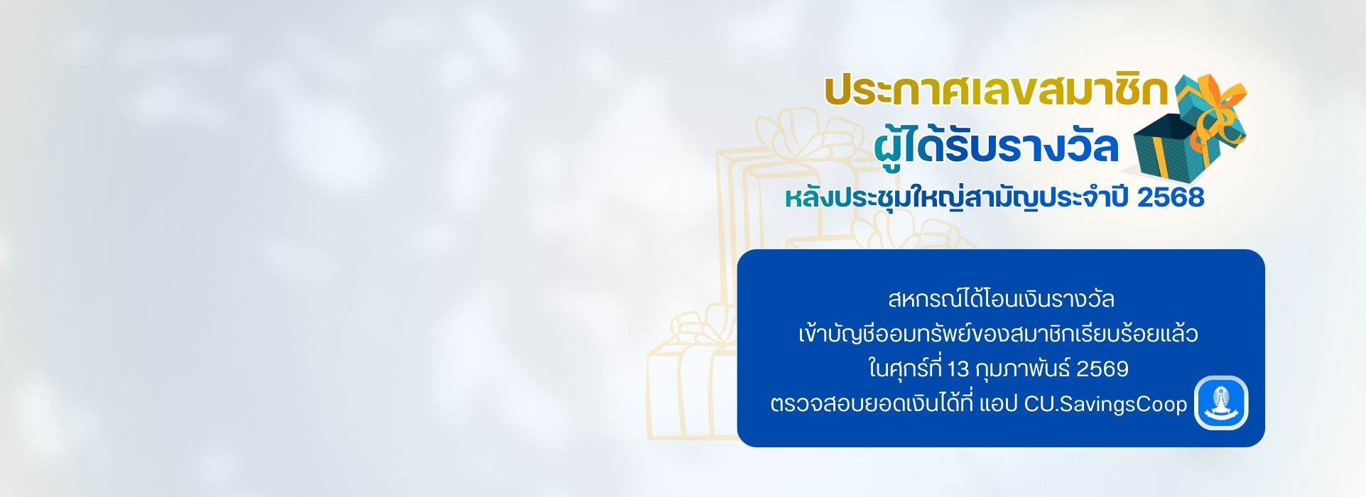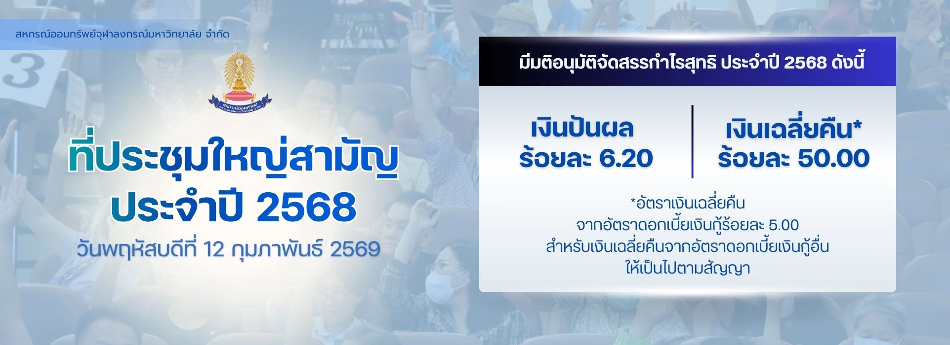 | วงเงินกู้ไม่เกิน 1,500 ล้านบาท ทั้งนี้ เป็นไปตามหลักเกณฑ์ที่สหกรณ์ออมทรัพย์จุฬาฯ กำหนด | |||